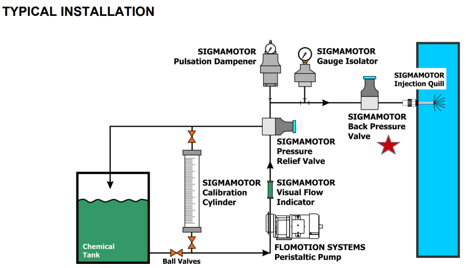 Generally, the back pressure valve can be installed anywhere in the discharge line, provided there is some downstream pressure at the dosage point. If there is no downstream pressure the back pressure valve should be installed at the dosage point to prevent siphoning and drainage of the chemical line.